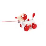 Ontmoet Jack. De trekfiguur kleine hond rood Jack volgt je graag. Jack is circa 18 cm lang en circa 14 centimeter hoog en 9.5 cm breed. Jack is gemaakt van hout. Op zijn rug heeft Jack een knop zitten en als je daarop drukt dan hoor je een geluidje. Je dreumes gaat zich uren vermaken met Jack.